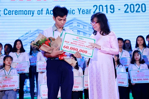 Dịp này, Quỹ học bổng Hoa Anh Đào của trường vinh danh và trao 140 suất học bổng khuyến tài gồm: 01 suất học bổng toàn phần 100% học phí toàn khóa học (tương đương 60 triệu đồng/suất), 48 suất học bổng bán phần 50% học phí toàn khóa học (tương đương 30 triệu đồng/suất) và 91 suất học bổng 30% học phí toàn khóa (tương đương 18 triệu đồng/suất) cho sinh viên có kết quả đầu vào cao năm 2019.