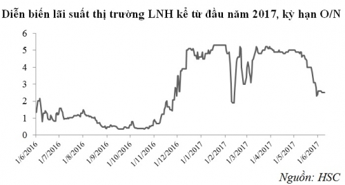 Lãi suất trên thị trường LNH giảm sâu cùng với việc giao dịch trên OMO ở mức thấp điều này cho thấy thời điểm hiện tại, thanh khoản đang khá ổn định, khá tương đồng so với cùng kỳ 2016. Chốt phiên cuối tuần lãi suất chào bình quân phổ biến quanh: O/N 2,5%; 1W 2,5%; 2W 3%; 1M 3,1%.