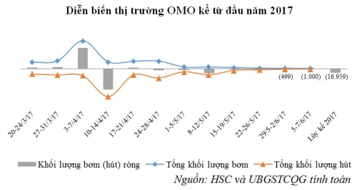 Như vậy, NHNN hút ròng 1.000 tỷ đồng. Từ đầu tháng 5 đến thời điểm hiện tại, giao dịch trên thị trường OMO đều ở mức tương đối thấp. Tính đến 9/06, khối lượng lưu hành trên kênh Repos ở mức 676 tỷ đồng và sẽ đáo hạn toàn bộ trong tuần tới. NHNN tiếp tục không chào thầu nghiệp vụ Outright.
