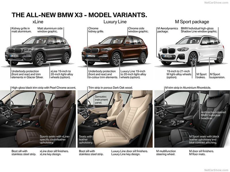 Tại Anh, khách hàng sẽ có 3 tùy chọn ngoại thất gồm: SE, xLine và M Sport. Bản tiêu chuẩn SE được trang bị bánh xe hợp kim 18 inch, ghế da trong khi bản xLine sẽ có thêm trang bị off-road. Phiên bản M Sport lần đầu tiên xuất hiện trên X3 được bổ sung gói trang bị thể thao, trang bị cá nhân hóa tùy chọn dành cho khách hàng.