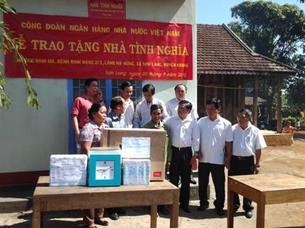 Công đoàn Ngân hàng Nhà nước Việt Nam (NHNN) vừa phối hợp với Công đoàn cơ sở NHNN chi nhánh tỉnh Gia Lai tổ chức lễ trao nhà tình nghĩa cho ông Đinh Má ở làng Hà Nừng, xã Sơn Lang, huyện Kbang (Gia Lai) là bệnh binh hạng 2/3, với số tiền hỗ trợ xây dựng nhà 35 triệu đồng.