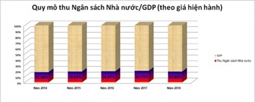 Cụ thể, theo dự toán, tổng thu cân đối NSNN năm 2019 khoảng 1.411,3 nghìn tỷ đồng, tăng 3,9% so ước thực hiện năm 2018. Tỷ lệ huy động vào NSNN khoảng 23% GDP; trong đó từ thuế, phí khoảng 20% GDP.