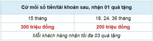 Ưu đãi lãi suất: Áp dụng các kỳ hạn từ 15 tháng đến 36 tháng, tặng thêm 0,1%/năm lãi suất cho khách hàng đến hạn 15 tháng và gửi lại kỳ hạn 18, 24, 36 tháng và tặng thêm 0,2%/năm cho khách hàng gửi tiền trên Internet, Mobile Banking.