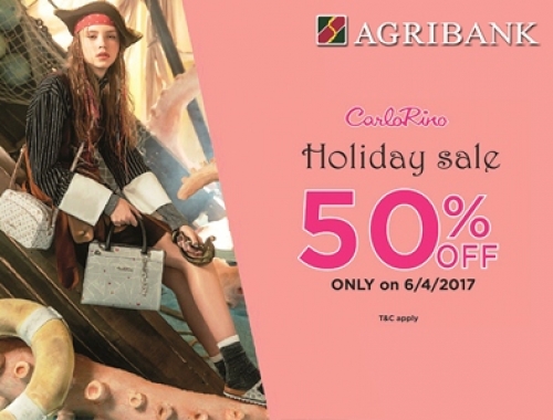 Từ ngày 06/4/2017, Agribank phối hợp cùng thương hiệu Carlo Rino dành tặng khách hàng cơ hội mua sắm các sản phẩm hàng hiệu với mức giá vô cùng hấp dẫn. Theo đó, trong duy nhất ngày 06/4/2017, khách hàng được giảm 50% cho tất cả các sản phẩm trên tổng hóa đơn khi thanh toán bằng thẻ Agribank tại hệ thống cửa hàng Carlo Rino trong khu vực Hà Nội và thành phố Hồ Chí Minh.