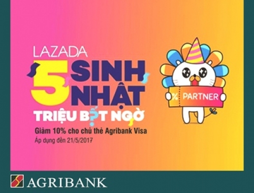 Từ nay đến hết ngày 21/5/2017, khách hàng là chủ thẻ Agribank Visa khi thanh toán tại www.lazada.vn/visa và ứng dụng của Lazada trên điện thoại di động/máy tính bảng sẽ được nhận ưu đãi giảm giá đến 10%.