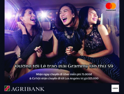 Từ nay đến hết ngày 24/12/2016, khách hàng thực hiện chuyến đi Uber và nhập mã khuyến mại GRAMMYS2017 khi thanh toán bằng thẻ Agribank MasterCard trong thời gian khuyến mại sẽ nhận được 1 chuyến đi miễn phí trị giá 75.000 đồng. Đồng thời, khách hàng may mắn nhất sẽ có cơ hội nhận được giải thưởng trị giá 25.000USD là chuyến đi tới Los Angeles – Mỹ dành cho hai người để tham dự Lễ trao giải Grammy lần thứ 59.