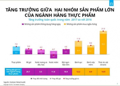 Tuy nhiên, khi quan sát kỹ hơn vào hai nhóm sản phẩm chính của ngành hàng thực phẩm, thì các sản phẩm thuộc nhóm thông dụng hàng ngày (bao gồm mì gói, nước tương, dầu hào, nước mắm và bột ngọt, bột nêm) lại không thể hiện sự tăng trưởng mạnh mẽ như các sản phẩm thuộc nhóm sản phẩm được mua “ngẫu hứng” (bao gồm bánh quy, bánh xốp mềm, snack). Trong đó, các sản phẩm snack cho thấy sự tăng trưởng ấn tượng, đạt mức 21% trong năm 2017.