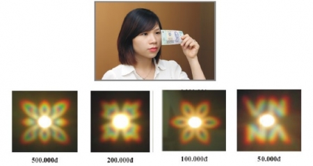 2. Cửa sổ nhỏ có yếu tố hình ẩn (DOE): là chi tiết nền nhựa trong suốt, ở phía trên bên trái mặt trước tờ tiền. Khi đưa cửa sổ gần sát mắt, nhìn xuyên qua cửa sổ tới nguồn sáng đỏ (bóng đèn sợi đốt, ngọn lửa...) sẽ thấy hình ẩn xung quanh nguồn sáng.