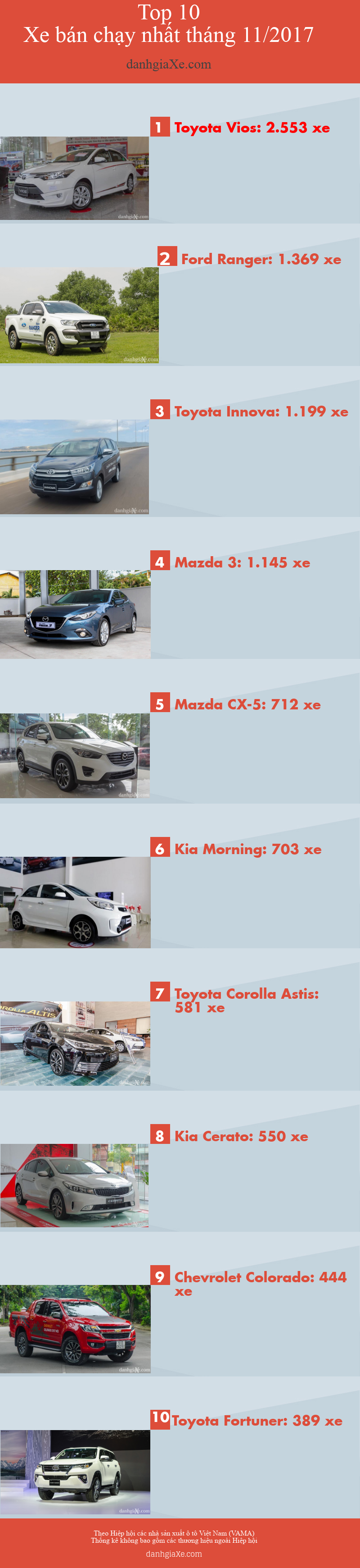 Top 10 xe tháng 11/2017: Fortuner giảm doanh số, Vios đạt kỷ lục trong năm