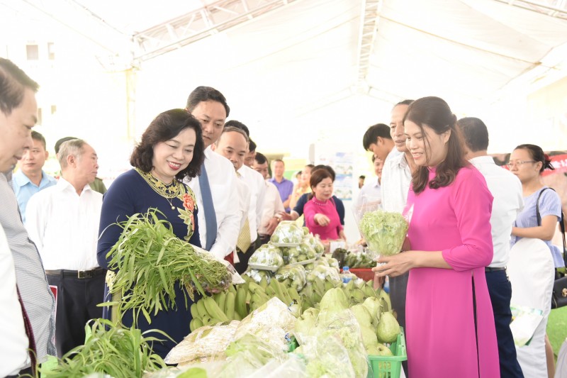 | Phó Bí thư Thường trực Thành ủy Hà Nội Ngô Thị Thanh Hằng thăm gian hàng nông sản của huyện Gia Lâm |