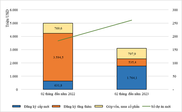 | Cơ cấu vốn đầu tư nước ngoài 2 tháng đầu năm 2023 so với cùng kỳ. |