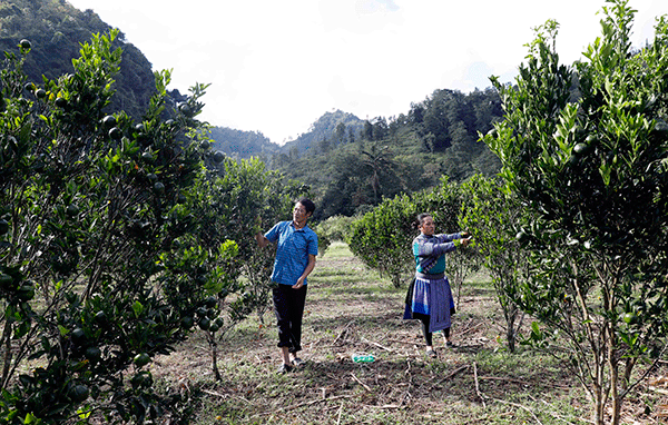 | Vợ chồng anh Lù Seo Khờ ở xã Tả Ngài Chồ chăm sóc vườn cam từ vốn vay chính sách |