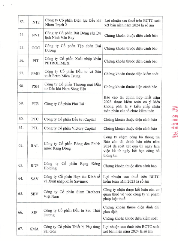 HOSE cũng bổ sung cổ phiếu NT2 của Công ty cổ phần Điện lực dầu khí Nhơn Trạch 2 vào danh sách không đủ điều kiện giao dịch ký quỹ, nguyên nhân do lợi nhuận sau thuế trên BCTC soát xét bán niên năm 2024 của NT2 là số âm.