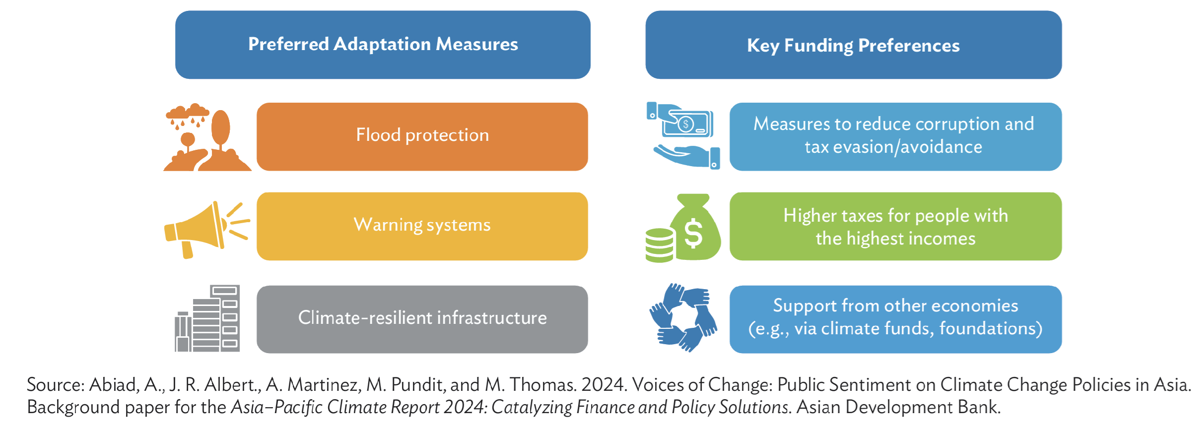 Báo cáo cho thấy xu hướng của người dân trong khu vực ủng hộ hành động vì khí hậu. Trong một nghiên cứu về nhận thức biến đổi khí hậu của ADB năm nay, 91% số người được hỏi tại 14 nền kinh tế trong khu vực cho biết họ coi hiện tượng ấm lên toàn cầu là một vấn đề nghiêm trọng, trong đó nhiều người mong muốn chính phủ có hành động quyết liệt hơn.