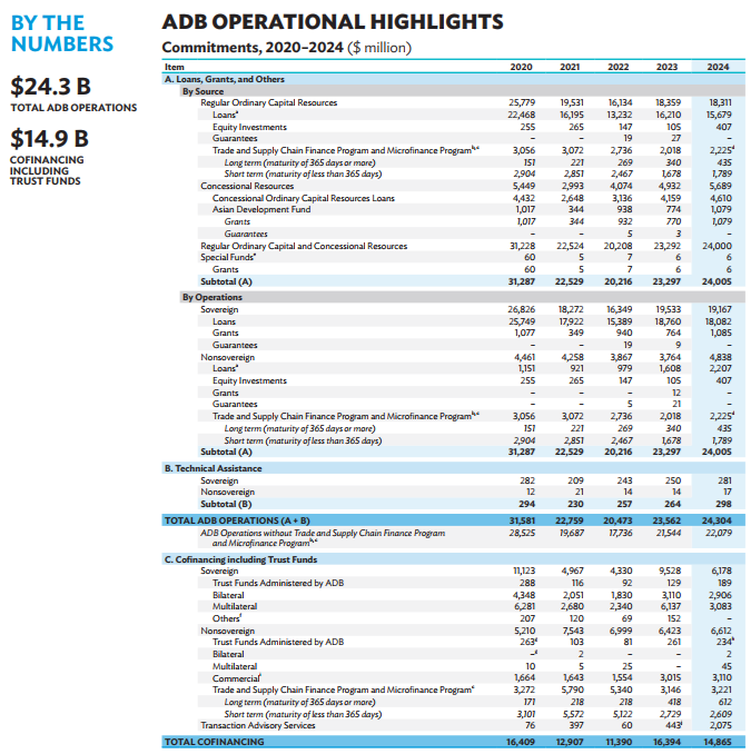Chủ tịch ADB, ông Masato Kanda, chia sẻ: "Với năng lực tài chính được tăng cường và trọng tâm chiến lược sắc bén hơn, ADB đang biến cam kết thành những kết quả cụ thể. Chúng tôi đang tài trợ cho các hệ thống năng lượng và giao thông hiệu quả với giá cả phù hợp hơn, hỗ trợ một khu vực tư nhân năng động tạo ra việc làm có chất lượng tốt hơn và tăng cường các dịch vụ cơ bản trong giáo dục, y tế và bảo trợ xã hội. Cùng với các đối tác của mình, chúng tôi đang xây dựng một tương lai tươi sáng hơn cho thế hệ tiếp theo ở Châu Á và Thái Bình Dương.”