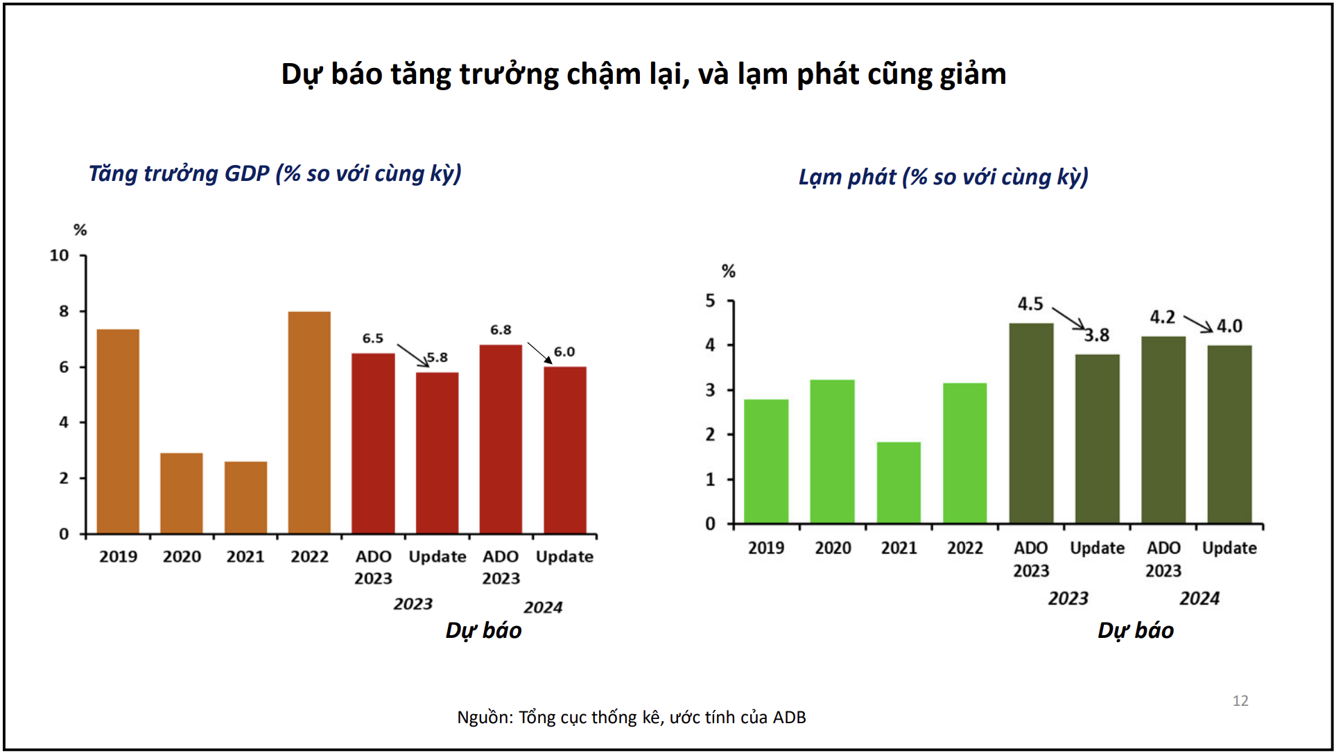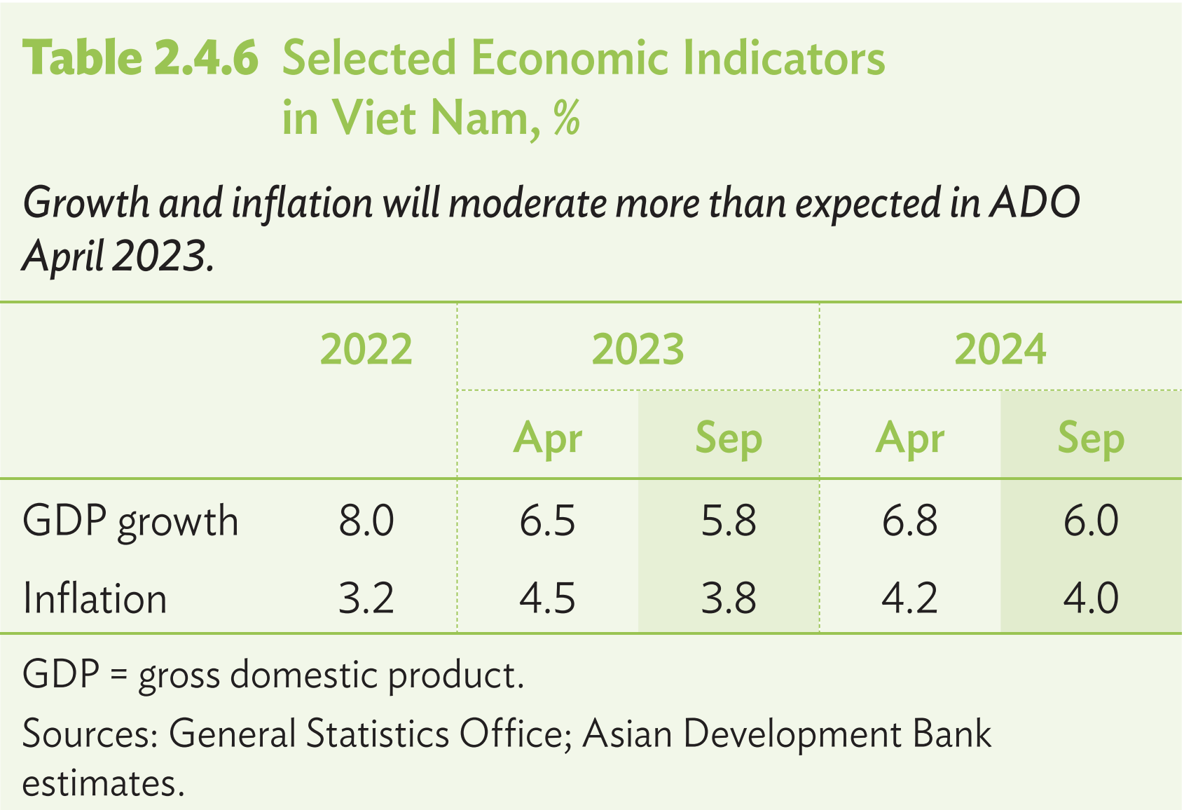 Dự báo tăng trưởng và lạm phát trong lần cập nhật ADO này được điều chỉnh giảm so với dự báo trong tháng 4 năm 2023. Theo đó, tăng trưởng kinh tế hiện dự báo giảm còn 5,8% vào năm 2023 trước khi tăng lên 6,0% trong năm 2024. Dự báo lạm phát cũng giảm xuống. Các yếu tố chính tác động đến nền kinh tế là tình trạng suy giảm kinh tế toàn cầu, sự thắt chặt tiền tệ ở một số nước phát triển và tác động cuộc xung đột Nga – Ukraine vẫn đang tiếp diễn.