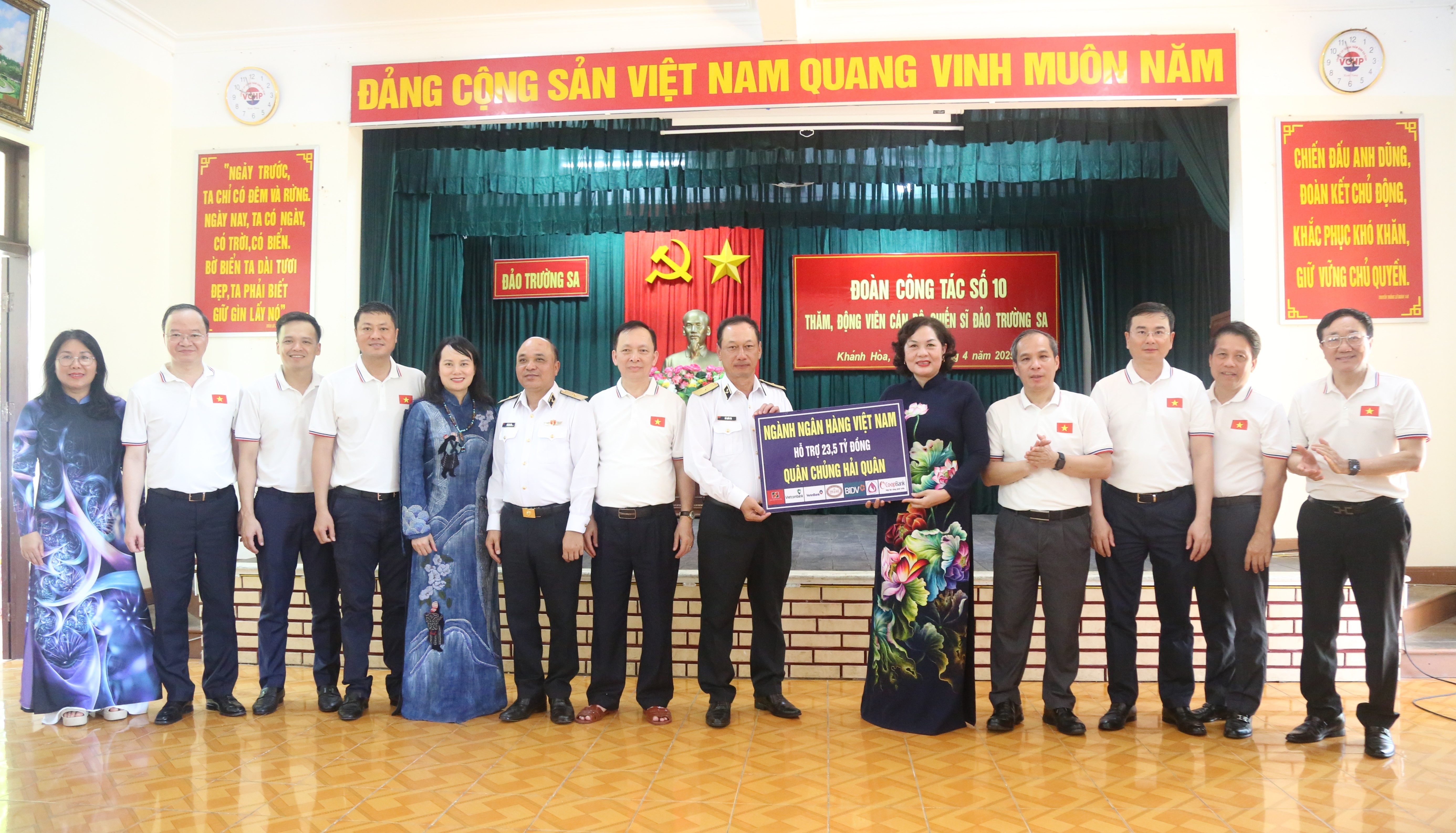 Tại đây, Đoàn cũng đã trao tặng hỗ trợ trị giá 23,5 tỷ đồng cho Quân chủng Hải quân, bao gồm các thiết bị, vật tư thiết yếu nhằm nâng cao đời sống và điều kiện làm việc của quân dân Trường Sa. Ngoài ra, Ngân hàng Nhà nước còn hỗ trợ thêm 1 tỷ đồng cho cán bộ, chiến sĩ đảo Song Tử Tây, cùng nhiều phần quà là hiện vật có ý nghĩa thiết thực phục vụ quân dân huyện đảo và Nhà giàn DK1. Công đoàn ngành Ngân hàng cũng dành tặng hơn 250 triệu đồng từ nguồn đóng góp của cán bộ, nhân viên trong toàn ngành cho các đảo, nhà giàn mà Đoàn công tác số 10 chưa có điều kiện tới thăm trong chuyến công tác lần này.