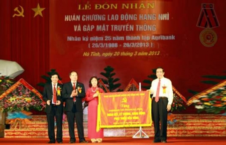 Cũng tại buổi lễ, thừa ủy quyền Chủ tịch nước, Bí thư Tỉnh ủy Nguyễn Thanh Bình trao tặng Huân chương Lao động hạng Nhì, đồng thời tặng bức trướng của Tỉnh ủy với dòng chữ “Đoàn kết - Kỷ cương - Năng động - Phát triển bền vững” cho Agribank chi nhánh Hà Tĩnh.