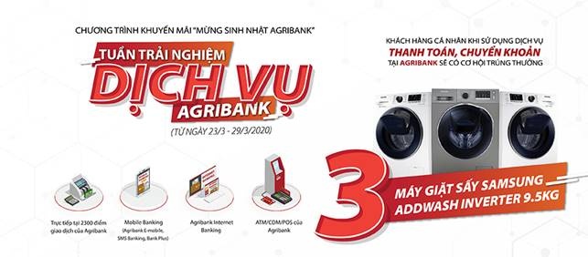 Đặc biệt, trong tuần sinh nhật tuổi 32 của Agribank từ ngày 23/3/2020 đến hết 29/3/2020, khi khách hàng thực hiện các giao dịch chuyển tiền, thanh toán tại các kênh như trên, sẽ được tham gia ngay chương trình quay số của Tuần sinh nhật Agribank, dự kiến tổ chức vào ngày 5/4/2020 để có cơ hội trúng 3 giải thưởng Sinh nhật, mỗi giải là máy giặt sấy Samsung AddWash Inverter 9,5 kg WD95K5410OX/SV trị giá gần 20 triệu đồng. Đồng thời, với các mã dự thưởng tuần, khách hàng vẫn tiếp tục được tham gia quay số may mắn cuối chương trình với hơn 500 giải thưởng giá trị.