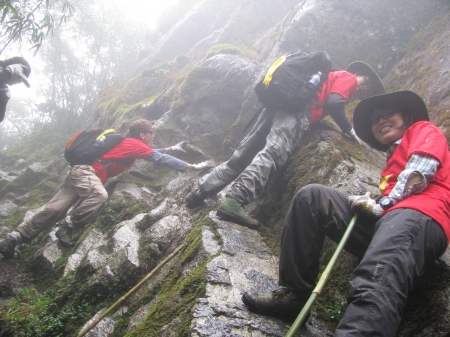 Nhân, một du khách vừa kết thúc chuyến “hành xác” leo đỉnh Fanxipan vẫn chưa hết cảm giác ngộp thở, chia sẻ: “Trong suốt hành trình dài 3143m, chủ yếu đoàn di chuyển trên men sườn núi và đỉnh núi. Địa hình thì muôn hình vạn trạng. Có đoạn dốc đá dựng đứng, có đoạn hẹp chỉ đi vừa một bàn chân, phải nép mình vào sườn đá không dám nhìn xuống vì dưới là vực thẳm, nhưng “rợn” nhất vẫn là những vách đá lởm chởm, phải dùng cả chân và tay để bò, đến giờ tôi vẫn cảm giác sợ…”.