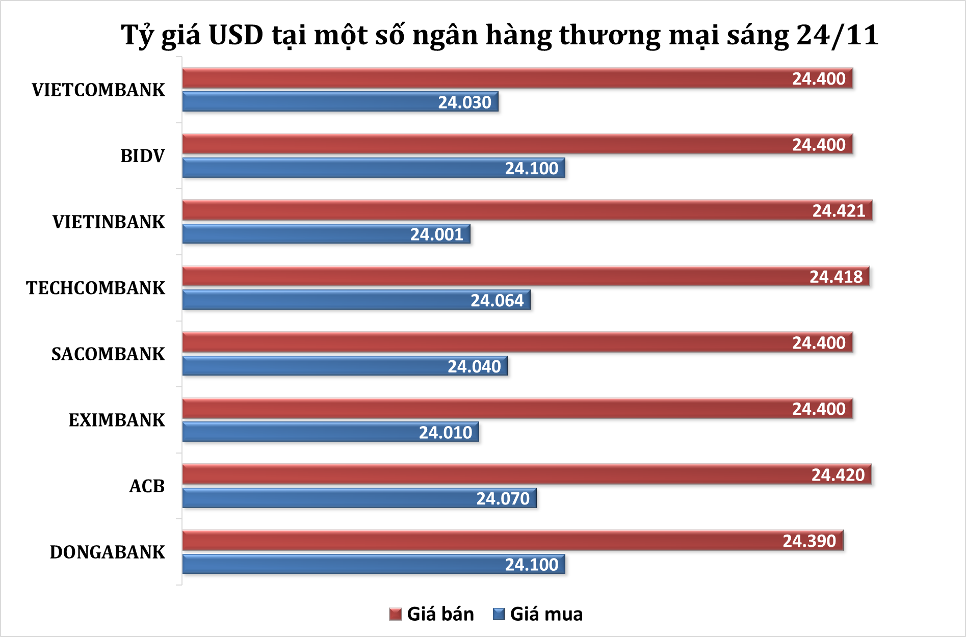 Cụ thể, tính đến 9h sáng nay, giá mua USD thấp nhất đang ở mức 24.001 VND/USD (cao hơn 36 đồng), giá mua cao nhất đang ở mức 24.100 VND/USD (cao hơn 100 đồng). Ở chiều bán ra, giá bán thấp nhất đang ở mức 24.390 VND/USD (cao hơn 40 đồng), giá bán cao nhất đang ở mức 24.420 VND/USD (cao hơn 35 đồng).