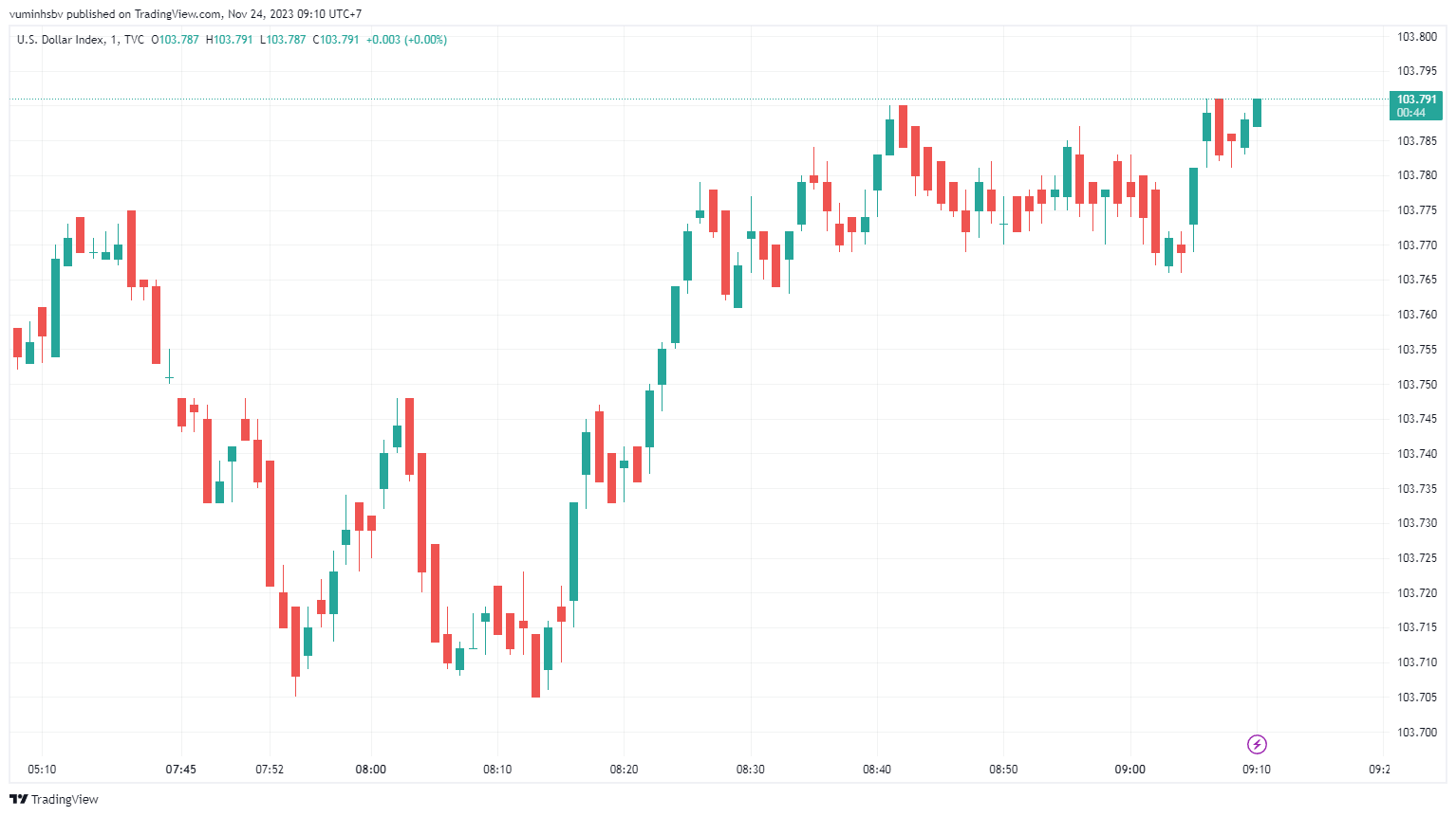 Chỉ số đô la Mỹ (DXY), đo lường biến động của bạc xanh so với 6 đồng tiền chủ chốt (EUR, JPY, GBP, CAD, SEK, CHF), hiện ở mức 103,791 điểm, tăng 0,041 điểm so với thời điểm mở cửa.