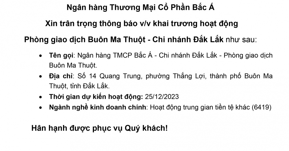 Đường dẫn bài viết: https://thoibaonganhang.vn/ngan-hang-thuong-mai-co-phan-bac-a-thong-bao-khai-truong-hoat-dong-phong-giao-dich-buon-ma-thuot-chi-nhanh-dak-lak-147399.htmlIn bài viết