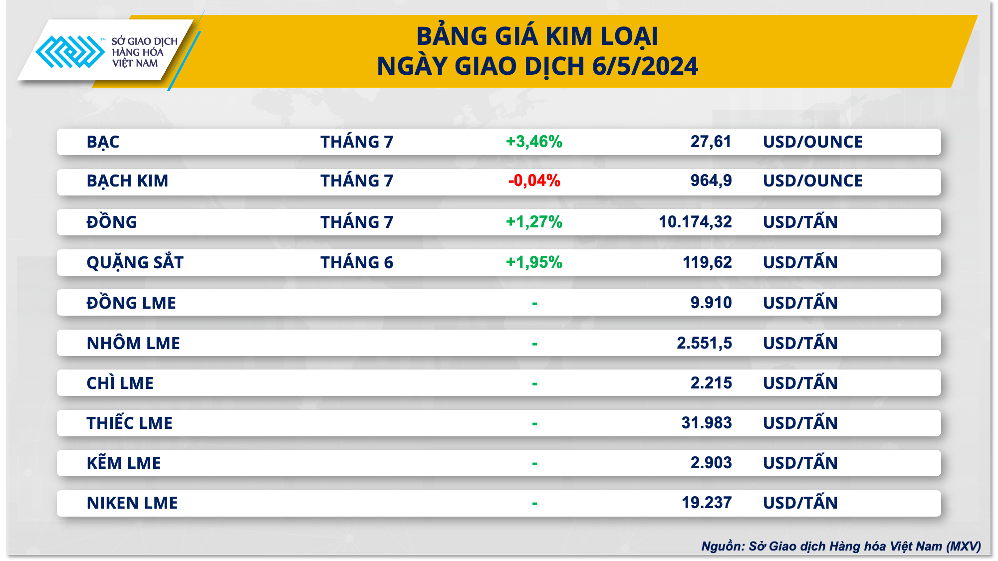 Kết thúc ngày giao dịch đầu tuần 6/5, sắc xanh áp đảo trên bảng giá kim loại. Đối với kim loại quý, giá các mặt hàng được hỗ trợ nhờ phát huy vai trò trú ẩn an toàn khi xung đột ở Trung Đông diễn biến căng thẳng đồng thời áp lực vĩ mô cho thấy tín hiệu hạ nhiệt. Chốt ngày, giá bạc tăng 3,46% lên 27,61 USD/oz. Tuy nhiên, giá bạch kim giảm nhẹ 0,04% chủ yếu do hoạt động chốt lời của nhà đầu tư.