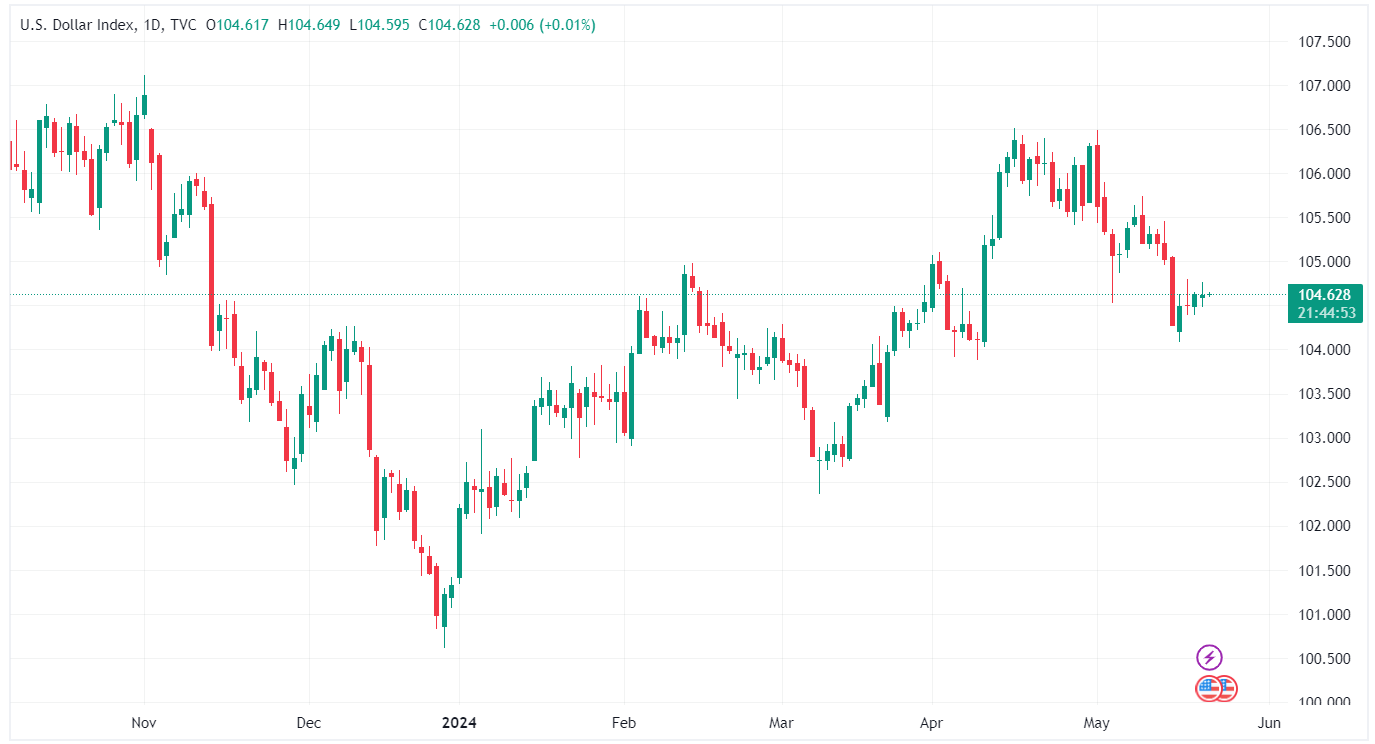 Chỉ số đô la Mỹ (DXY), đo lường biến động của bạc xanh so với 6 đồng tiền chủ chốt (EUR, JPY, GBP, CAD, SEK, CHF), hiện ở mức 104,628 điểm, tăng nhẹ +0,006 điểm so với thời điểm mở cửa.