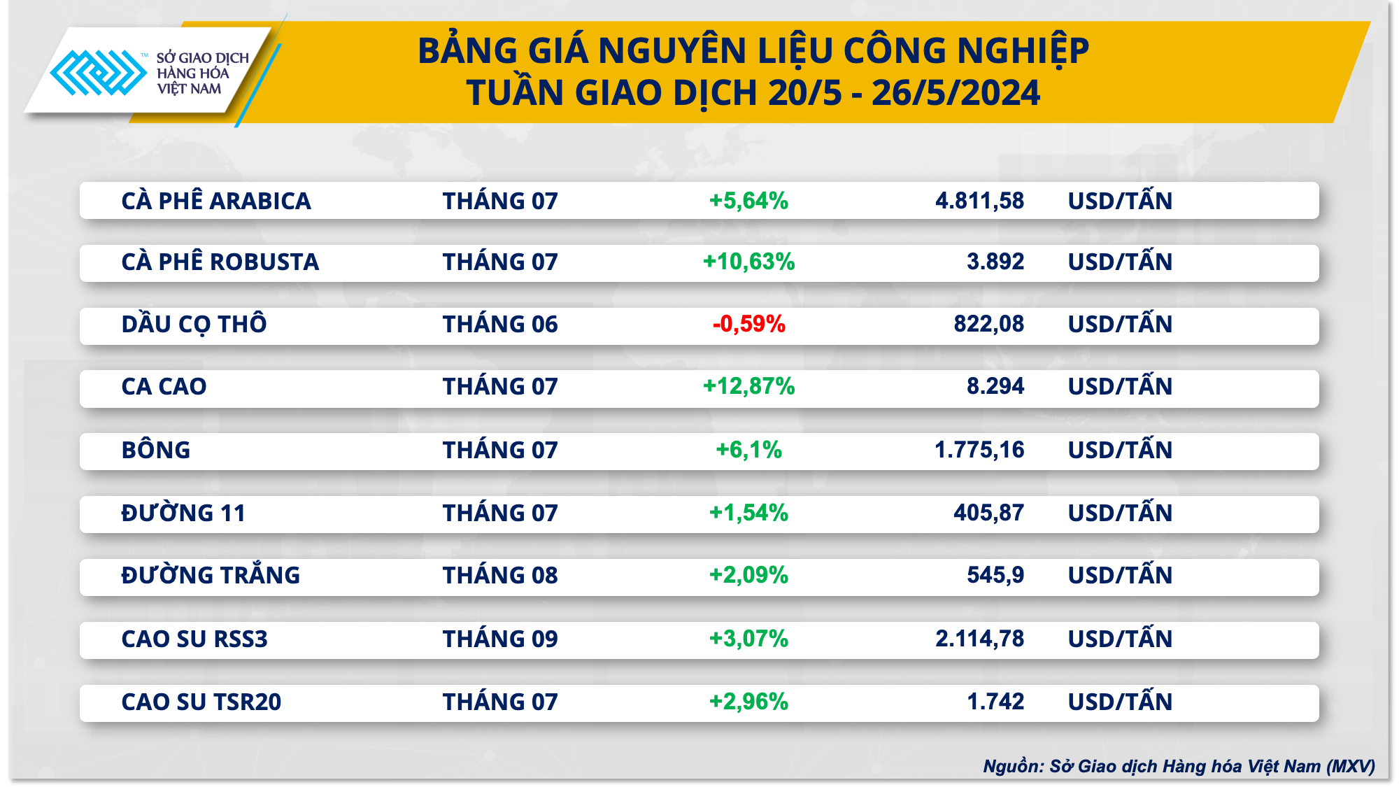 Thị trường cà phê nhanh chóng lấy lại đà tăng với Robusta tăng 10,6%, Arabica tăng 5,6%. Nguồn cung kém tích cực tại các quốc gia sản xuất chính đang gây tâm lý lo ngại thiếu hụt cà phê trên thị trường, từ đó hỗ trợ giá tăng trở lại. Trong báo cáo kết quả khảo sát mùa vụ 2024 lần thứ 2, Cơ quan Cung ứng mùa vụ thuộc chính phủ Brazil CONAB nâng dự sản lượng cà phê Robusta lên 58,8 triệu bao, tăng nhẹ so với mức 58,1 triệu bao trước đó.