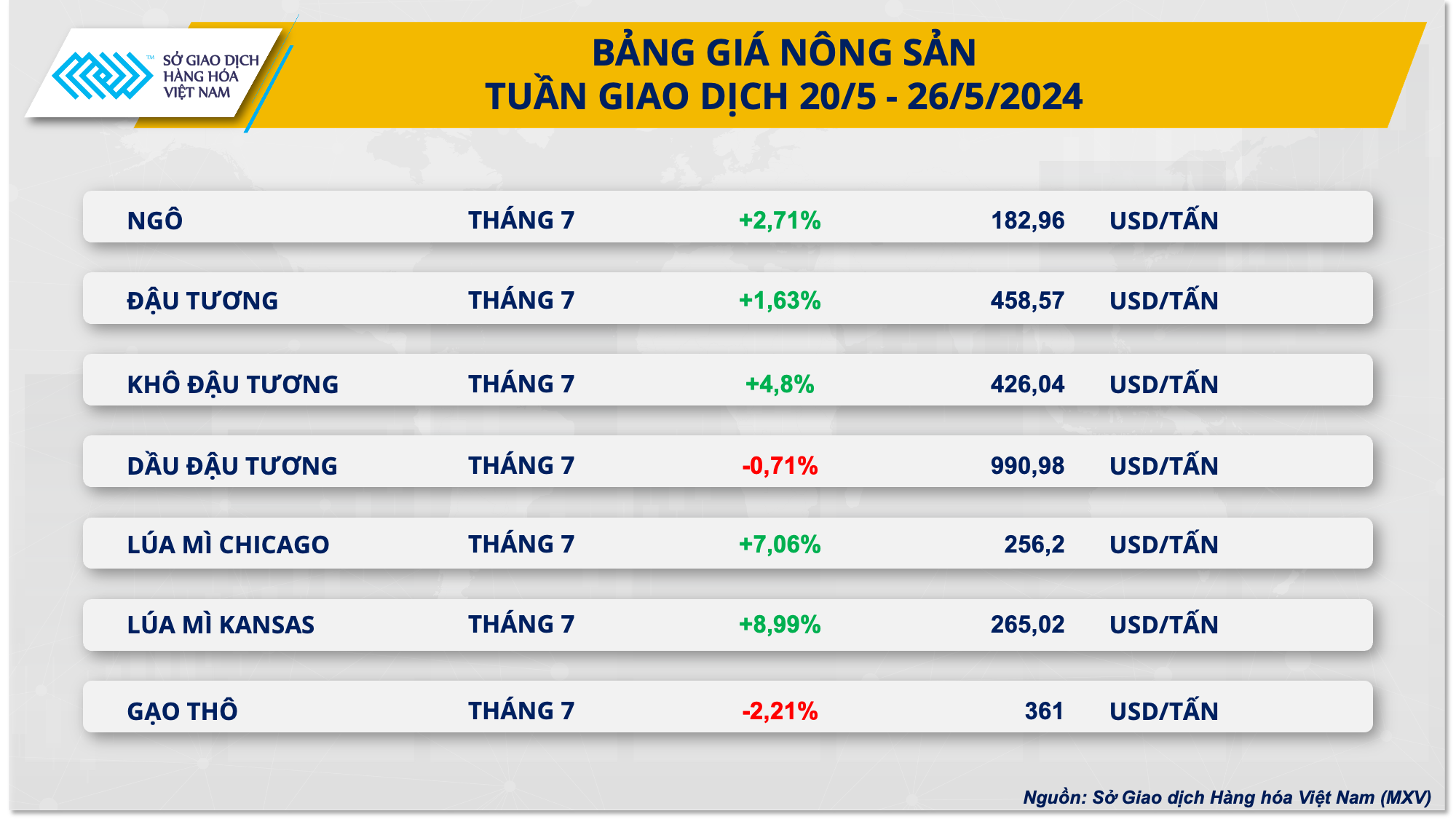 MXV cho biết, tuần này dự báo sẽ là một tuần rất sôi động của thị trường nông sản. Các Sở Giao dịch tại Mỹ phần lớn sẽ đóng cửa nghỉ lễ trong hôm nay (27/5), và khi mở cửa trở lại từ ngày mai, nhóm nông sản có thể sẽ đón nhận lực mua mạnh, bởi tình trạng thu hoạch chậm trễ ở Brazil có thể ảnh hưởng tới nguồn cung trong giai đoạn giữa năm, giai đoạn mà nhu cầu nhập khẩu từ các nước Đông Á và Đông Nam Á thường rất lớn.