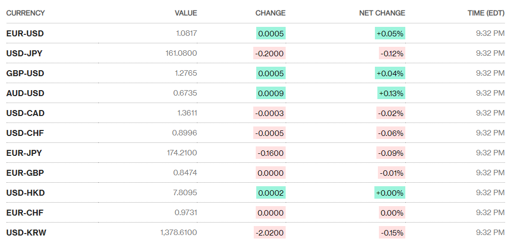 Ở nơi khác, yên Nhật tăng 0,12% lên 161,08 JPY/USD, tăng trong ngày thứ hai liên tiếp - điều chưa từng xảy ra kể từ đầu tháng Sáu.