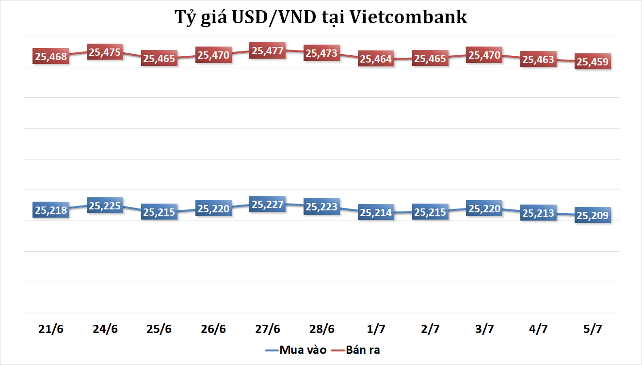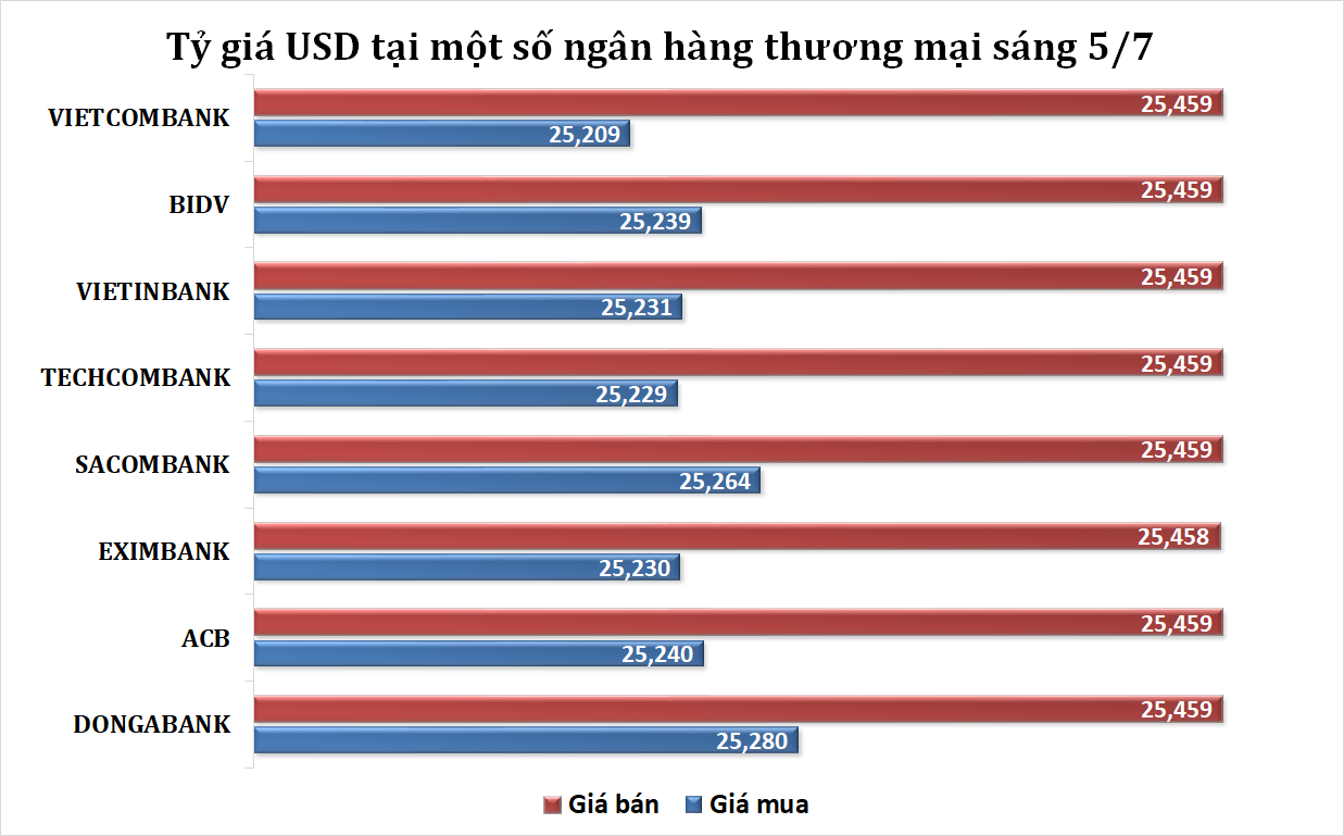 Cụ thể, tính đến 9h sáng nay, giá mua USD thấp nhất đang ở mức 25.209 VND/USD (thấp hơn 4 đồng), giá mua cao nhất đang ở mức 25.280 VND/USD. Ở chiều bán ra, giá bán USD được hầu hết các ngân hàng niêm yết ở mức 25.459 VND/USD (thấp hơn 4 đồng).