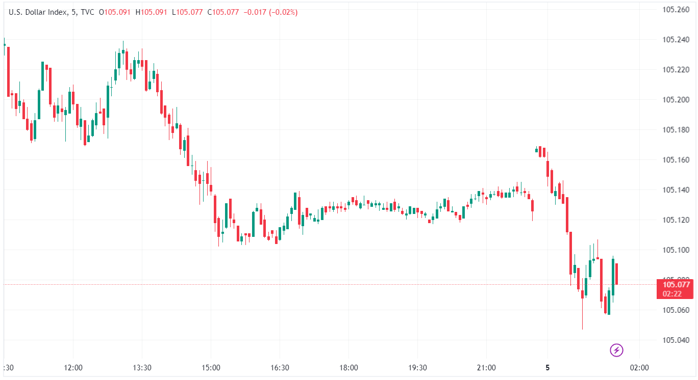 Chỉ số đô la Mỹ (DXY), đo lường biến động của bạc xanh so với 6 đồng tiền chủ chốt (EUR, JPY, GBP, CAD, SEK, CHF), hiện ở mức 105,077 điểm, giảm nhẹ 0,017 điểm so với thời điểm mở cửa.