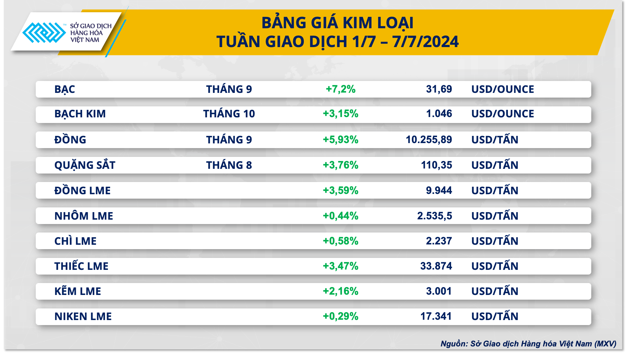 Đáng chú ý, khép lại tuần giao dịch đầu tiên của tháng 7, nhóm kim loại chứng kiến sự bứt phá mạnh mẽ khi giá các mặt hàng đồng loạt tăng mạnh, chấm dứt chuỗi nhiều tuần giao dịch trầm lắng. Đối với kim loại quý, giá bạc bứt phá hơn 7% lên 31,69 USD/oz, tiệm cận vùng đỉnh lịch sử 11 năm thiết lập vào cuối tháng 5. Đây cũng là tuần tăng giá mạnh nhất của giá bạc trong gần hai tháng. Theo sau là đà tăng của giá bạch kim với mức tăng 3,15% lên 1.046 USD/oz, mức cao nhất một tháng trở lại đây của mặt hàng này.