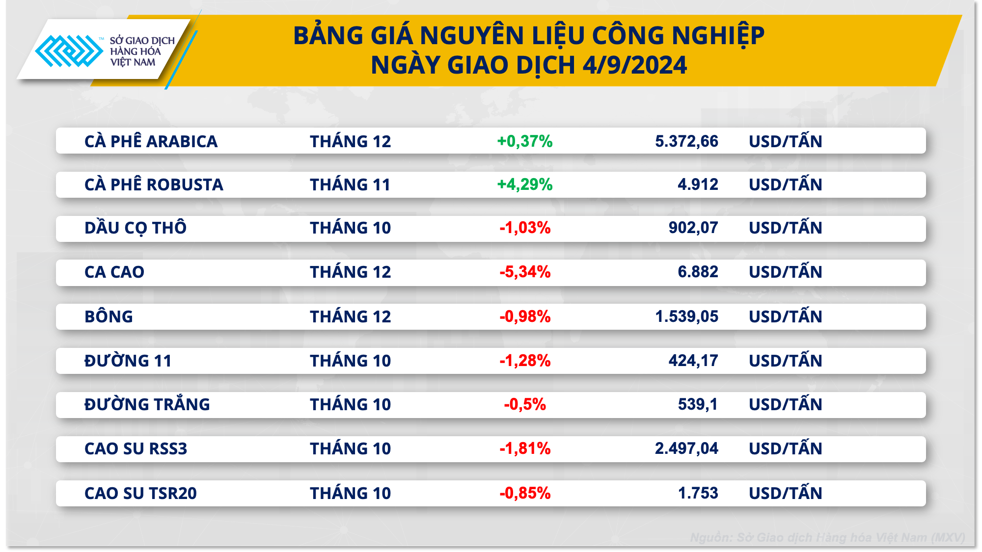 Đóng cửa, chỉ số MXV-Index rơi tiếp 0,45% xuống còn 2.090 điểm. Thị trường năng lượng tiếp tục chìm trong sắc đỏ, trong đó giá hai mặt hàng dầu suy yếu phiên thứ 3 liên tiếp. Hầu hết mặt hàng nhóm nguyên liệu công nghiệp giá đi xuống, ngoại trừ hai mặt hàng cà phê. Khoảng cách giữa Robusta và Arabica ngày càng thu hẹp do các đợt hồi phục và tăng giá liên tiếp trước của cà phê Robusta.