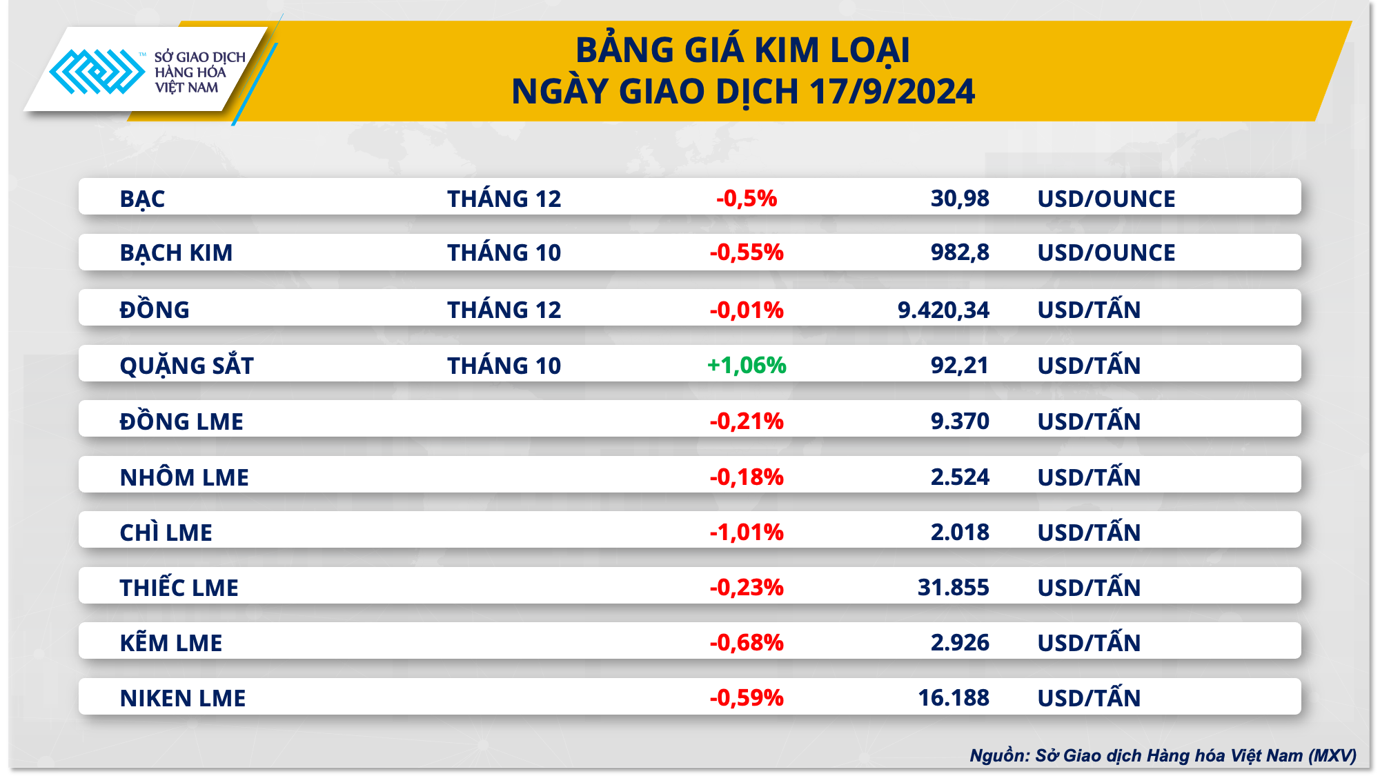 Theo MXV, đóng cửa phiên giao dịch 17/9, ngoại trừ quặng sắt, tất cả các mặt hàng kim loại đồng loạt giảm giá do thị trường đang thận trọng trước kế hoạch cắt giảm lãi suất của Cục Dự trữ Liên bang Mỹ (Fed). Đối với kim loại quý, giá bạc quay đầu giảm nhẹ 0,5% xuống 30,97 USD/oz, kết thúc chuỗi tăng ba phiên liên tiếp. Giá bạch kim cũng tiếp đà giảm với mức giảm 0,55% xuống 982,8 USD/oz.