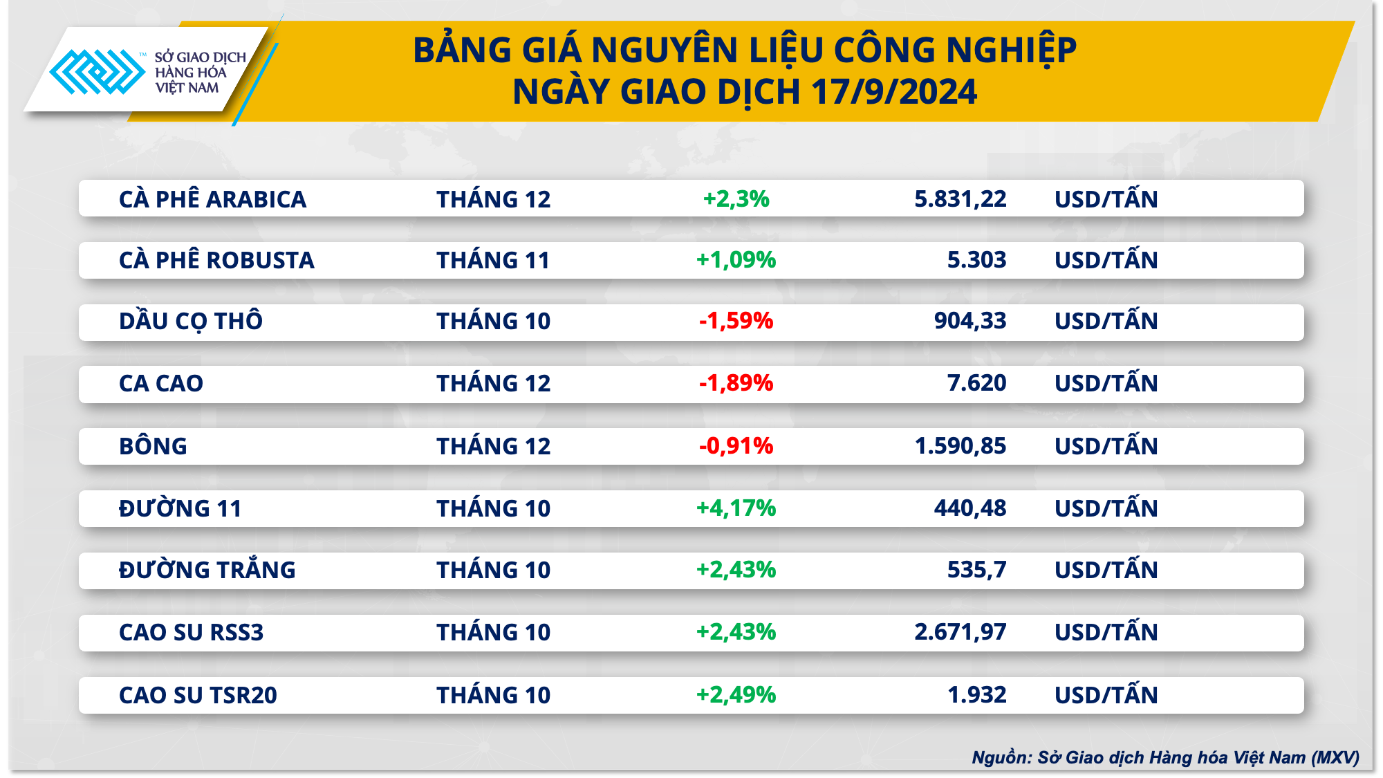 Lực mua chiếm ưu thế kéo chỉ số MXV-Index tăng thêm 0,41% lên 2.131 điểm. Đáng chú ý, trên thị trường nguyên liệu công nghiệp, giá hai mặt hàng cà phê quay đầu đi lên sau phiên điều chỉnh trước. Đi ngược chiều với xu hướng khởi sắc của toàn thị trường, nhóm kim loại (ngoại trừ quặng sắt), tất cả mặt hàng đồng loạt giảm giá.