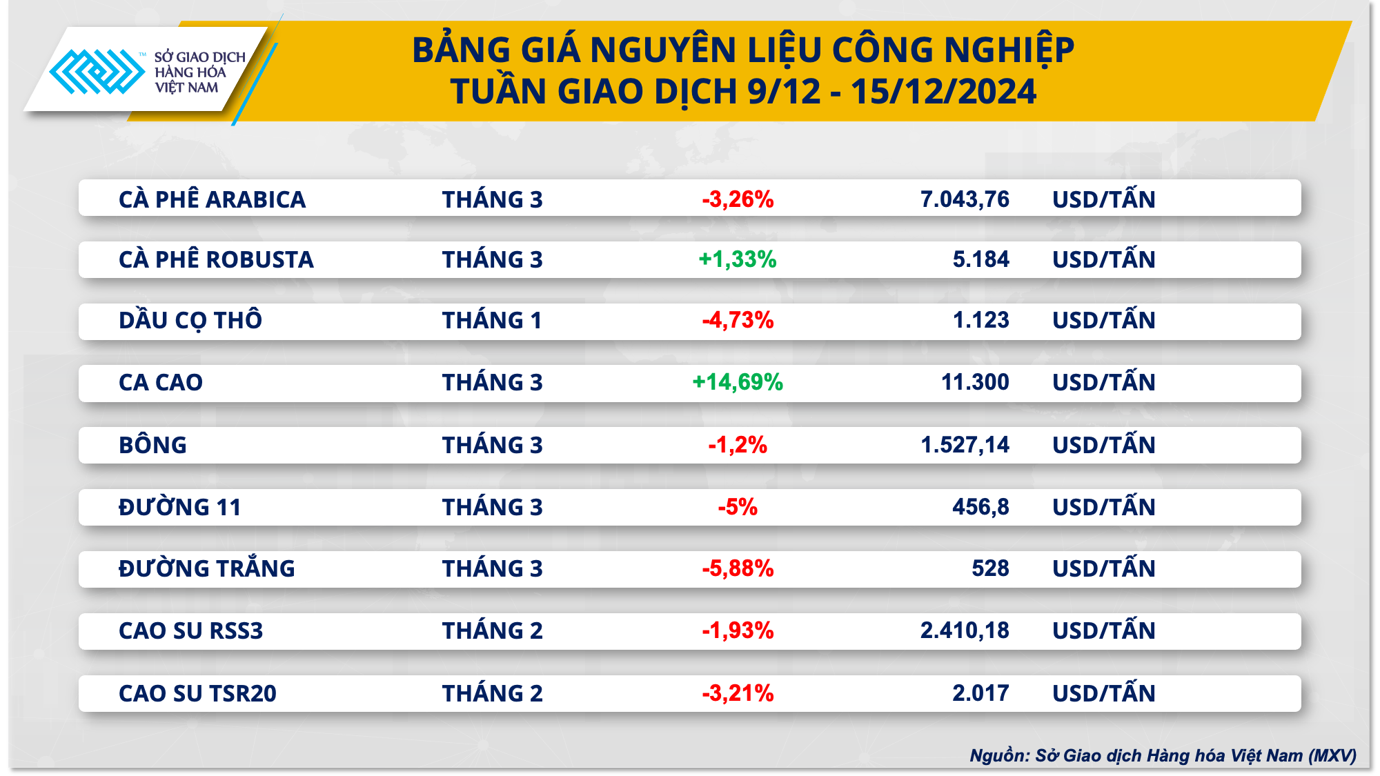 Theo MXV, sắc đỏ bao trùm thị trường nguyên liệu công nghiệp trong tuần giao dịch vừa qua, nhưng điểm sáng đáng chú ý đến từ đà tăng giá mạnh của mặt hàng ca cao.
