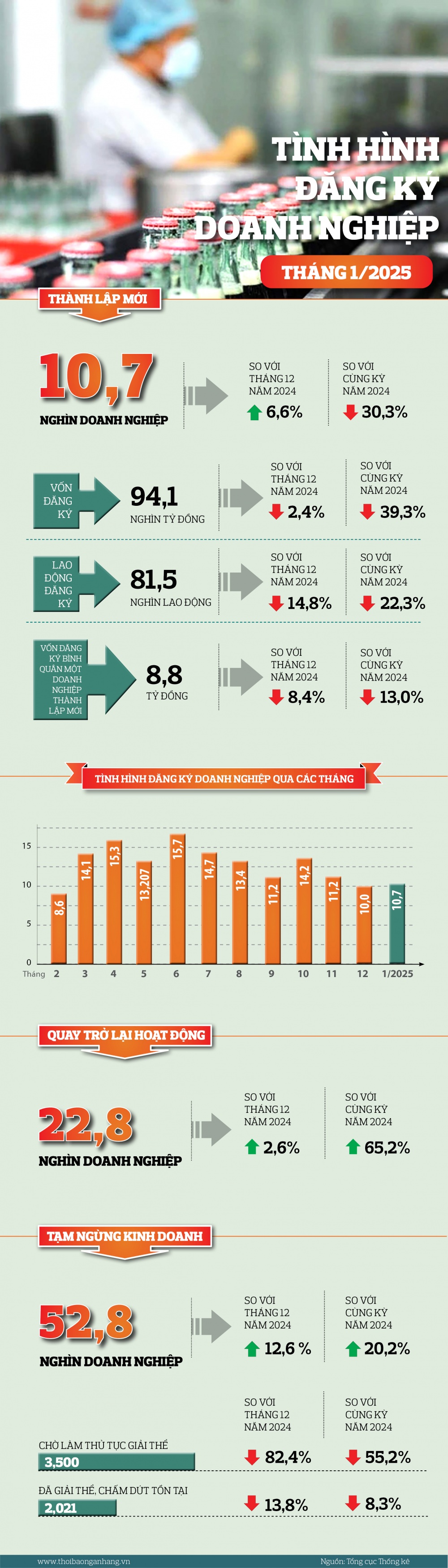 Đường dẫn bài viết: https://thoibaonganhang.vn/infographic-thang-1-doanh-nghiep-thanh-lap-moi-giam-von-dang-ky-tang-cao-160261.htmlIn bài viết