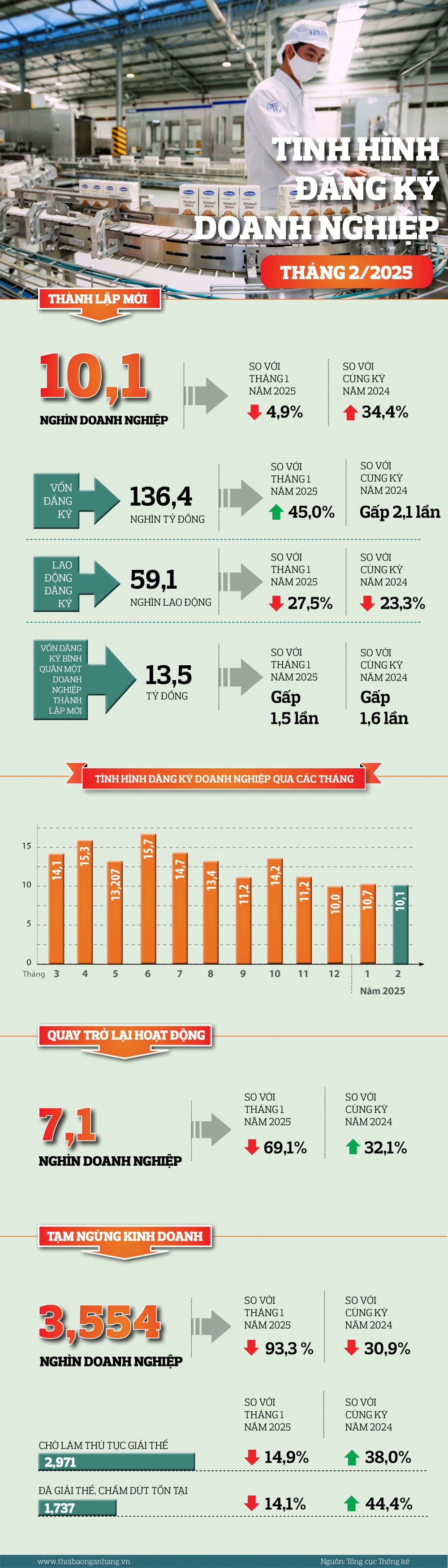 Đường dẫn bài viết: https://thoibaonganhang.vn/infographic-thang-22025-doanh-nghiep-thanh-lap-moi-giam-von-dang-ky-but-pha-161080.htmlIn bài viết