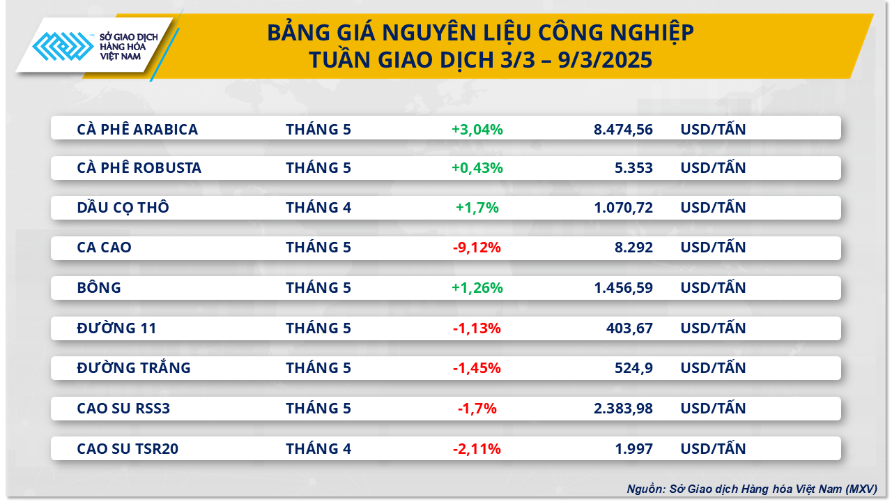 Trong bối cảnh đồng USD xuống gần mức thấp nhất trong 4 tháng, các chính sách thuế quan liên tục thay đổi khiến lo ngại về tăng trưởng kinh tế Mỹ gia tăng đã đẩy giá kim loại quý tăng mạnh. Trong khi đó, thị trường cà phê cũng trải qua nhiều phiên bật tăng rồi quay đầu suy yếu. Kết thúc tuần giao dịch, chỉ số MXV-Index tăng 0,65% so với đầu tuần trước, đóng cửa ở mức 2.279 điểm.