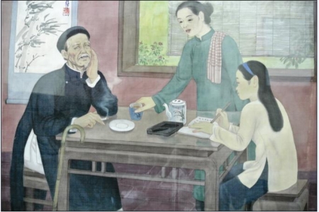 Gia đình nhà thơ Nguyễn Đình Chiểu, tranh lụa của họa sĩ Trương Văn Ý
