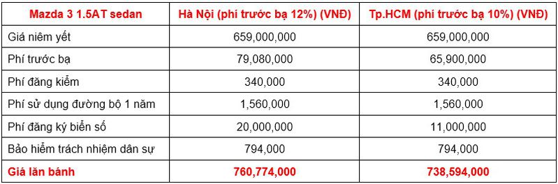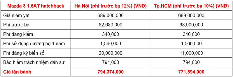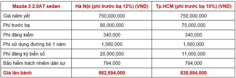 Do mức phí trước bạ và phí ra biển cao hơn so với các tỉnh thành khác nên trên tất cả các phiên bản tại, tổng chi phí lăn bánh của Mazda 3 ở Hà Nội đều cao hơn so với các tỉnh thành khác. Mức chênh lệch là khá đáng kể (khoảng từ 19 triệu đồng - 21 triệu đồng so với TP. Hồ Chí Minh, cao hơn khoảng 23 - 25 triệu đồng so với các tỉnh thuộc khu vực còn lại, tùy từng phiên bản).