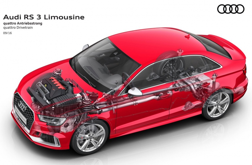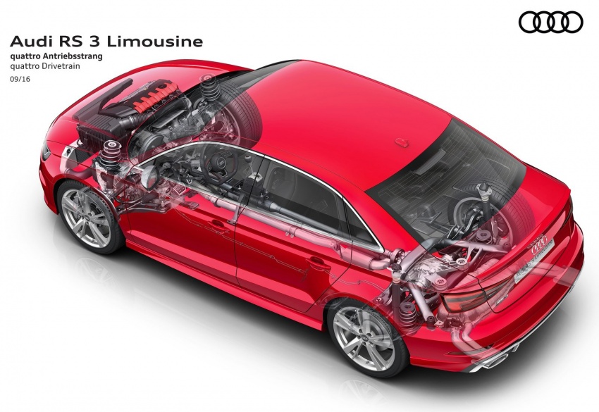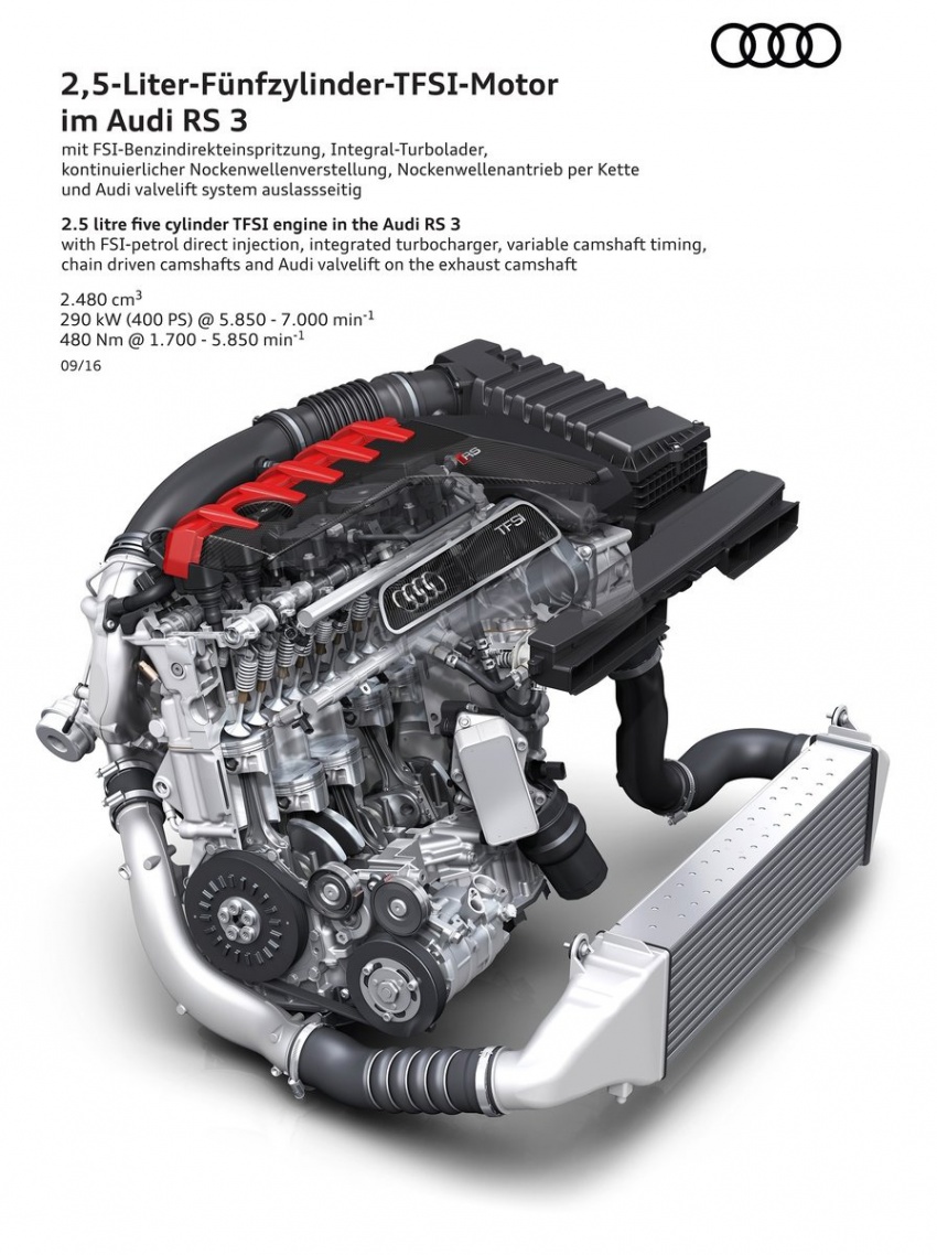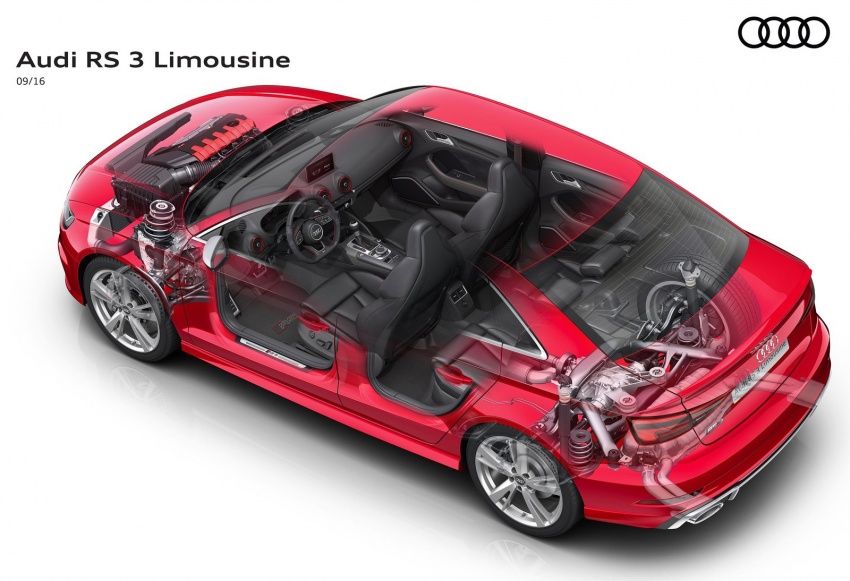 Đông cơ mới 2.5 TFSI cho công suất 400 mã lực (lớn hơn 33 mã lực so với phiên bản trước) và mô-men xoắn 480 Nm. RS Sedan có thể tăng tốc 0-100 km/h trong 4,1 giây và tốc độ tối đa được giới hạn điện tử 250 km/h nhưng Audi có thể sẽ tăng lên đến 280 km/h nếu có yêu cầu. Động cơ được kết hợp với hộp số S tronic 7 tốc độ ly hợp kép tự động, dẫn động 4 bánh toàn thời gian Quattro.