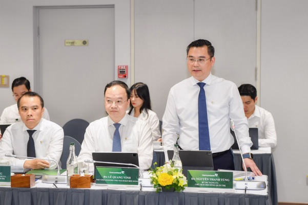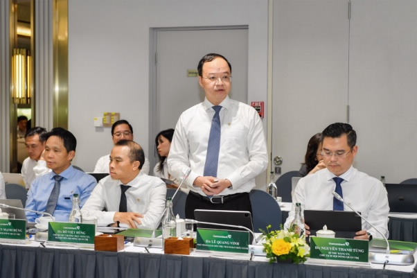 | Phó Tổng giám đốc phụ trách Ban điều hành Lê Quang Vinh báo cáo tình hình hoạt động của Vietcombank |