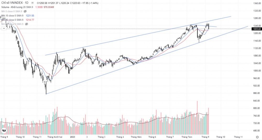 Về kỹ thuật, các chuyên gia cho rằng VN-Index giảm mạnh gần 18 điểm với mức volume tăng vọt hơn 30% so với trung bình cho thấy bên bán đang rất quyết liệt đẩy hàng ra thị trường. Chỉ số thủng mốc MA5 và đóng cửa trên MA10 báo hiệu xu hướng tăng ngắn hạn đã kết thúc, VN-Index có thể đi ngang trong vùng 1.215-1.250 điểm hoặc hình thành xu hướng giảm. Trong phiên tới, nhiều khả năng chỉ số sẽ test lại vùng 1.230 điểm trước khi đưa ra xu hướng rõ hơn.
