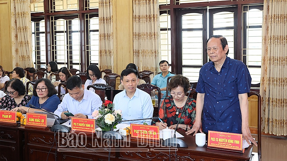 | PGS. TS. Nguyễn Hồng Vinh, Chủ tịch danh dự CLB Nhà báo Thành Nam phát biểu tại buổi làm việc. |
