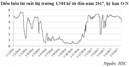 Tăng trưởng tín dụng 4 tháng đầu năm 2017 đạt 5,76%, cao nhất trong vòng 8 năm trở lại đây. Tín dụng tăng cao trong bối cảnh tăng trưởng huy động ước tính tăng 3,7% sẽ tạo áp lực mặt bằng lãi suất. Điều này phù hợp với diễn biến lãi suất thị trường trong thời gian qua, mặt bằng lãi suất có xu hướng tăng nhẹ kể từ tháng 3, tăng thêm 0,1-0,5%, một số ngân hàng phát hành chứng chỉ tiền gửi với lãi suất rất cao từ 8,6% đến 9,2%/năm.