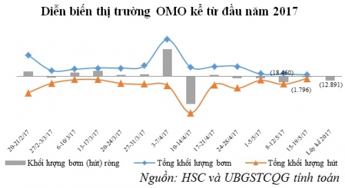 Trong 3 tuần kể từ đầu tháng 5, giao dịch trên thị trường OMO đều ở mức tương đối thấp. Tính đến 19/05, khối lượng lưu hành trên kênh Repos ở mức 47.44 tỷ đồng và sẽ đáo hạn toàn bộ trong tuần từ 22-26/5. NHNN tiếp tục không chào thầu nghiệp vụ Outright.